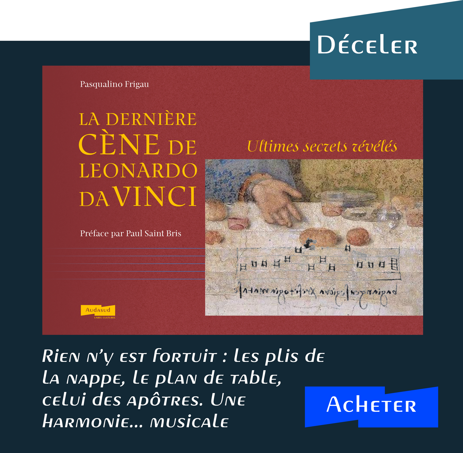 Musicien averti, l’auteur y perçoit des accords secrets, une harmonie… musicale. Dans ses pages, la Cène ne se fait pas seulement admirer, elle se fait entendre et nous joue sa partition. Rien n’y est fortuit : les plis de la nappe, le plan de table, celui des apôtres. Un hommage au peintre, inventeur, penseur et compositeur espiègle d’une musique que seul l’œil devine. Elle traversera son œuvre peinte, tapie dans le sourire de la Joconde ou le silence vibrant de la Dernière Cène.
