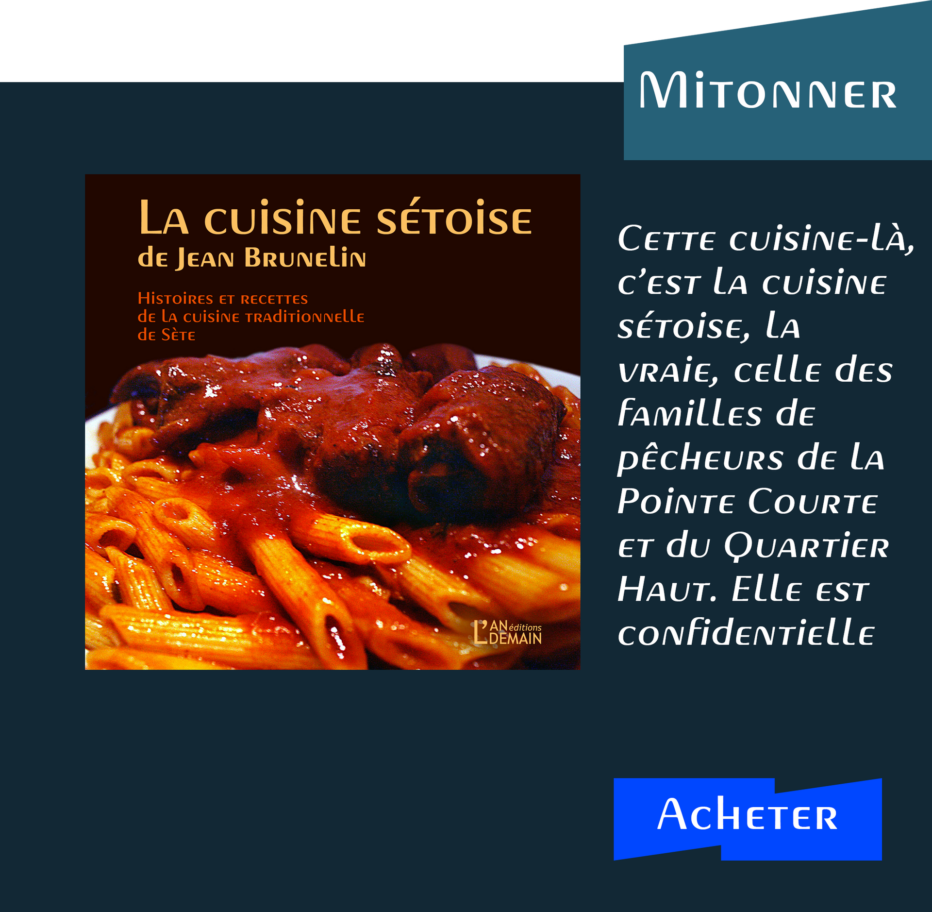 Ces quelques 118 recettes — une somme jamais publiée auparavant — sont d’abord celles des trésors de nos deux jardins potagers, la mer et l’étang, deux terroirs aquacoles qui ont vu germer au fil des siècles des assemblages d’ingrédients, parfois inopinés, souvent subtils, toujours savoureux. Et en garniture de ces recettes aux étapes superbement photographiées par l’auteur, c’est l’histoire d’un port, d’un Quartier Haut et d’une Pointe Courte qu’il nous fait revivre, racontée avec verve et illustrée d’images historiques.