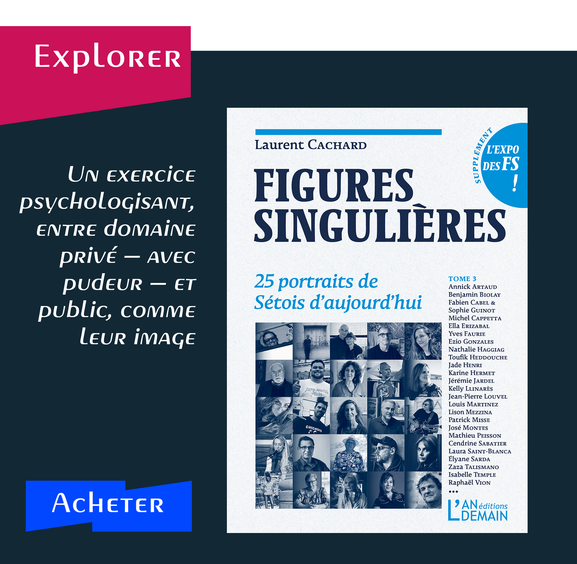 Figures Singulières, après la belle réception des deux premiers tomes. Toujours la même démarche, des portraits réalisés après entretien, publiés avec l’accord du ou de la portraiturée. Une histoire de la ville de Sète recomposée par ceux qui la font, des gens connus, d’autres moins, celle d’une rencontre avec des personnes déjà aperçues, ou pas.