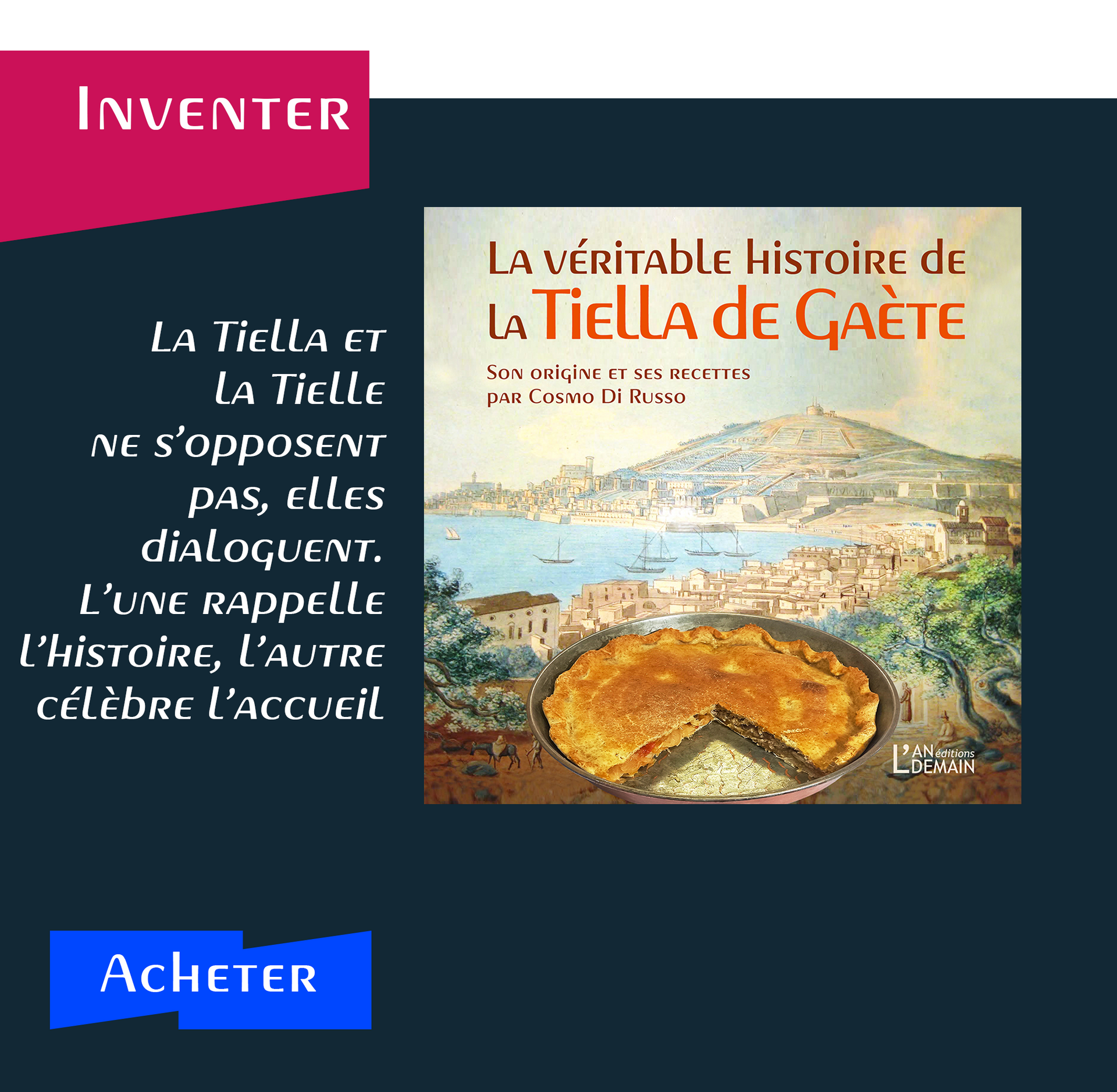 Cosmo Di Russo, avec son regard et son expérience d’historien amoureux de sa ville de Gaète, nous livre avec passion un récit autour de la Tiella qui traverse les siècles, de la Rome antique à nos jours. À travers ses recherches, et suite aux riches échanges qu’il a partagé avec quelques descendants des premiers Italiens de Sète, l'auteur replace l’histoire de la tielle pendant cette période et nous livre quelques unes des recettes les plus emblématiques de cette tourte magique.