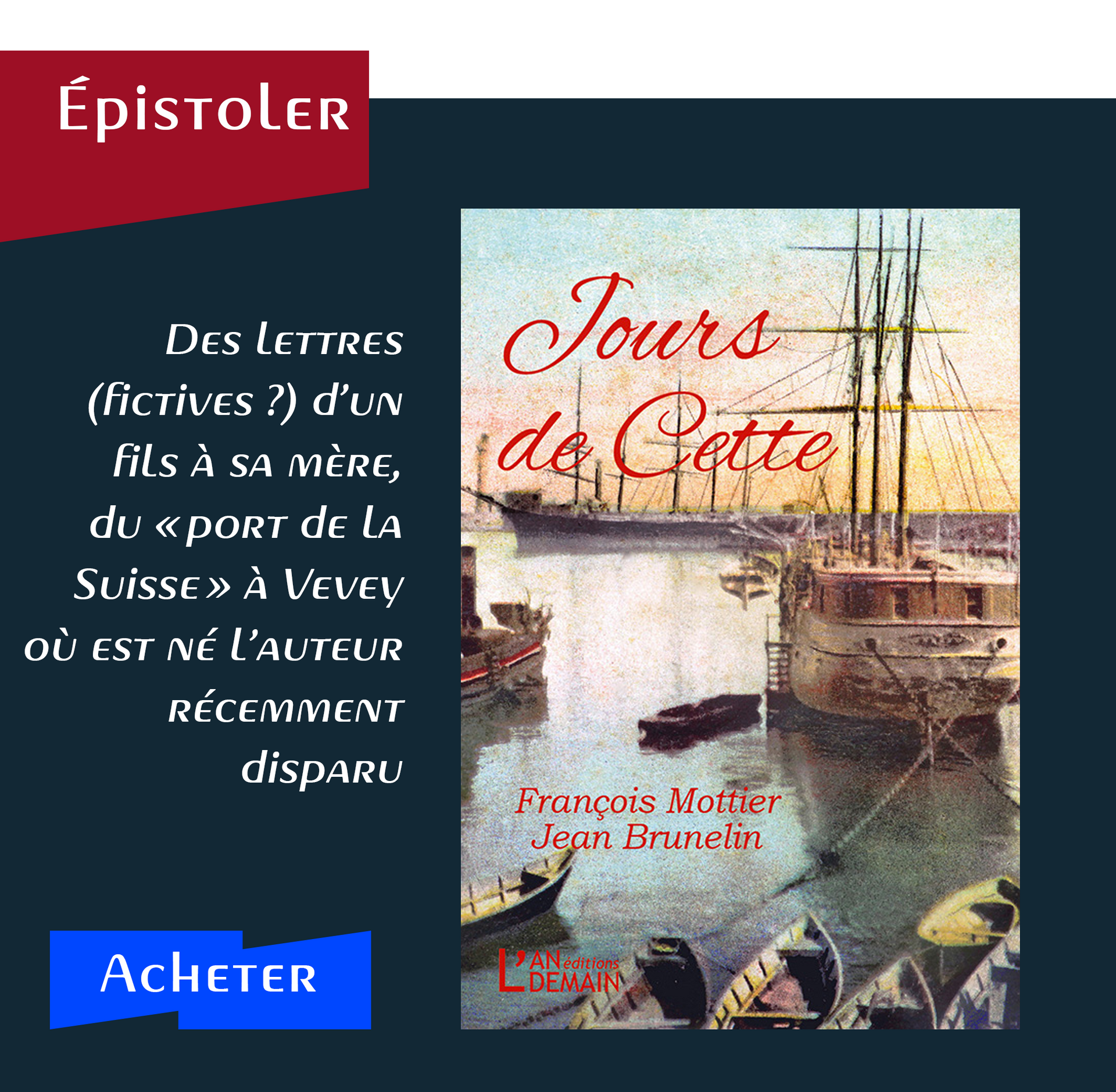Baptistin Vulliez était un Vaudois établi à Cette dans le négoce des vins, entre 1893 et 1913. Vingt années de croissance exceptionnelle pour la ville de Cette (orthographe officielle de Sète à l’époque), observées avec acuité et humour par le jeune Suisse dont les lettres, écrites à sa mère, en font un livre passionnant et érudit. Pour nous plonger dans ces années, les cartes postales choisies et restaurées par Jean Brunelin, créent un écrin délicieux, à la fois historique et onirique.