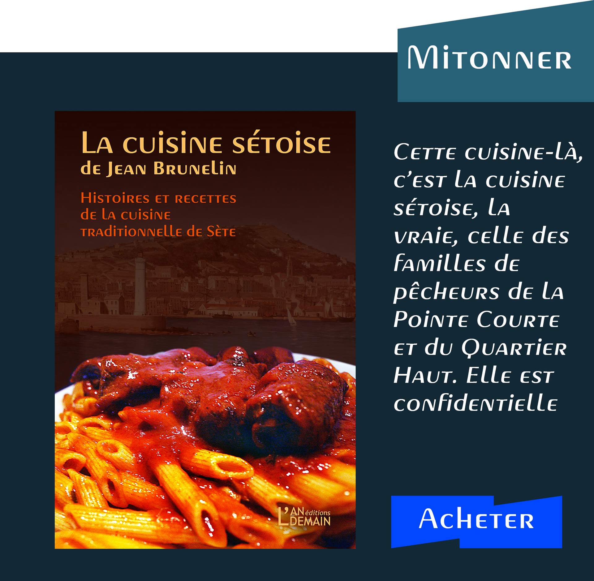 Ces quelques 118 recettes — une somme jamais publiée auparavant — sont d’abord celles des trésors de nos deux jardins potagers, la mer et l’étang, deux terroirs aquacoles qui ont vu germer au fil des siècles des assemblages d’ingrédients, parfois inopinés, souvent subtils, toujours savoureux. Et en garniture de ces recettes aux étapes superbement photographiées par l’auteur, c’est l’histoire d’un port, d’un Quartier Haut et d’une Pointe Courte qu’il nous fait revivre, racontée avec verve et illustrée d’images historiques.
