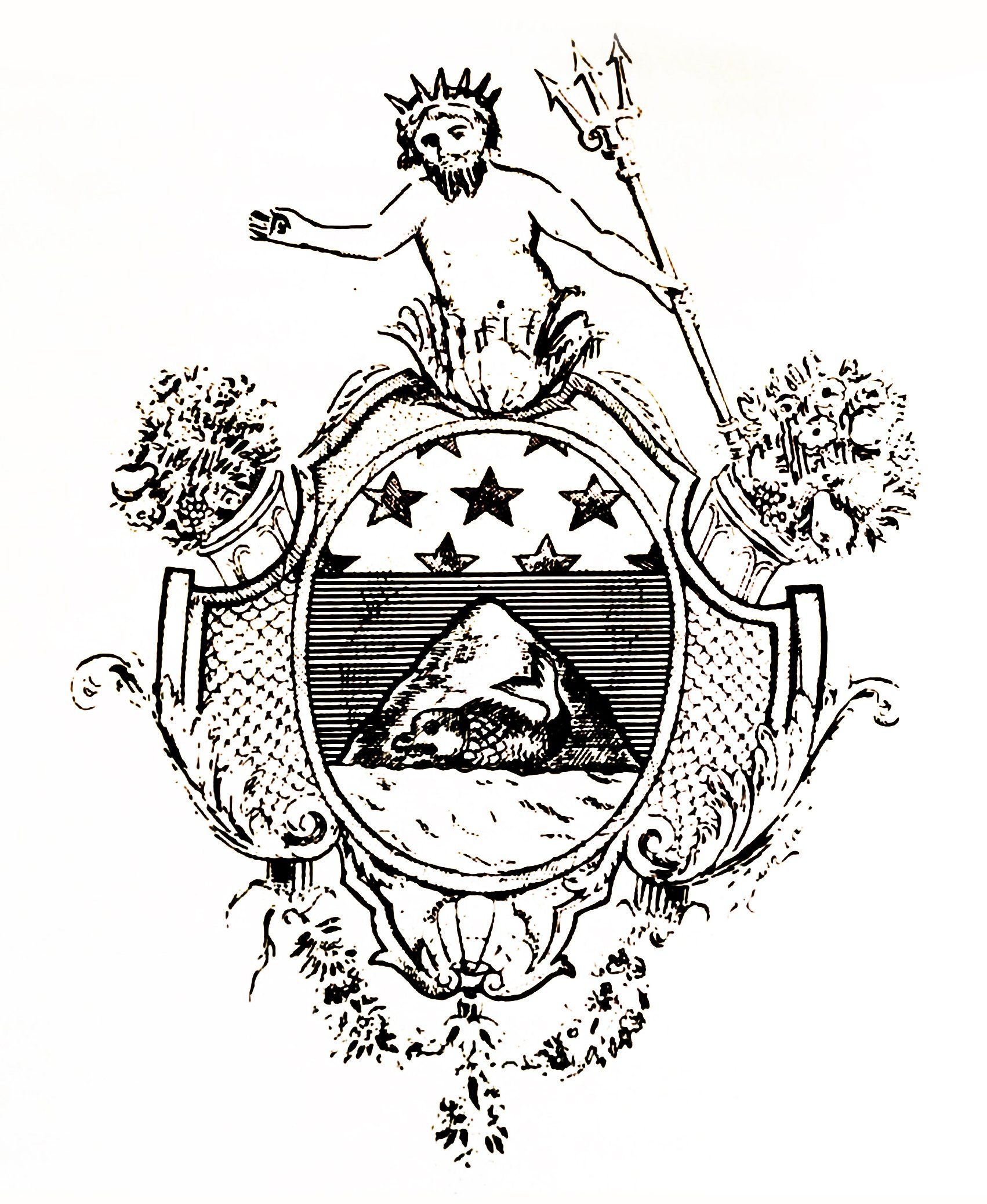 Ci-dessous : Armoiries délivrées en 1743 à la ville de Cette, dont le port fut créé à partir de 1666. Elles représentent un cétacé devant le mont Saint-Clair, sous Neptune et son trident.