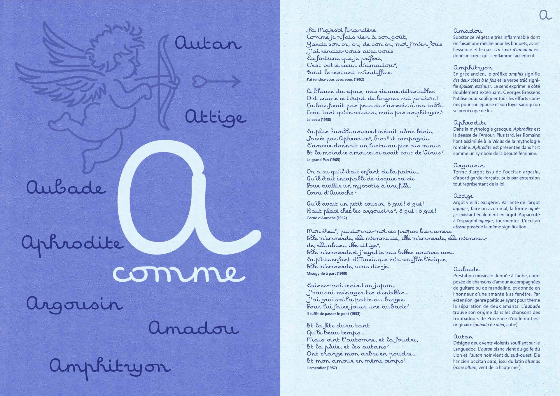 ABCs books are works that we find engaging and benevolent access. Articulated like a breadcrumb trail that can be followed, interrupted, and picked up where we left off, or on a new page, another letter of the alphabet. ALPHABRASSENS