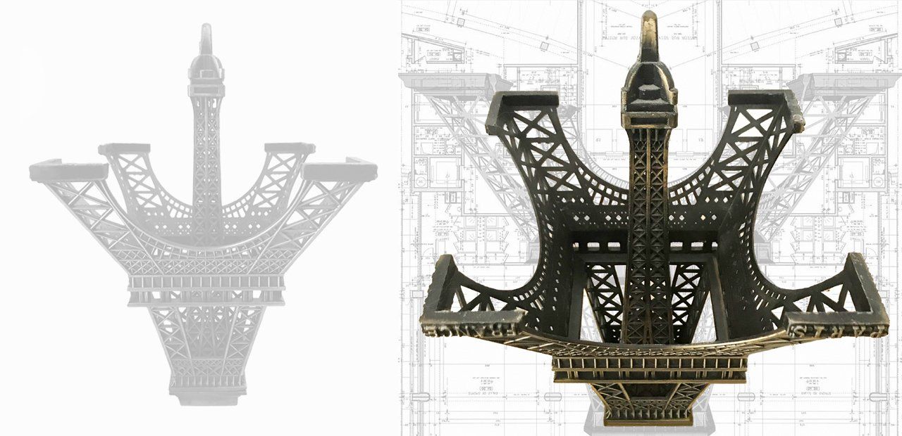 Observant une réplique de la vieille dame de fer sur une étagère, un matin de yoga, précairement campé selon la posture B72, qui comme chacun sait consiste à passer les jambes par dessus tête, je projetai alors ma contorsion sur l’objet devant mes yeux… Eureka ! m’écriais-je, imaginant ce(tte) tour de passe-passe.